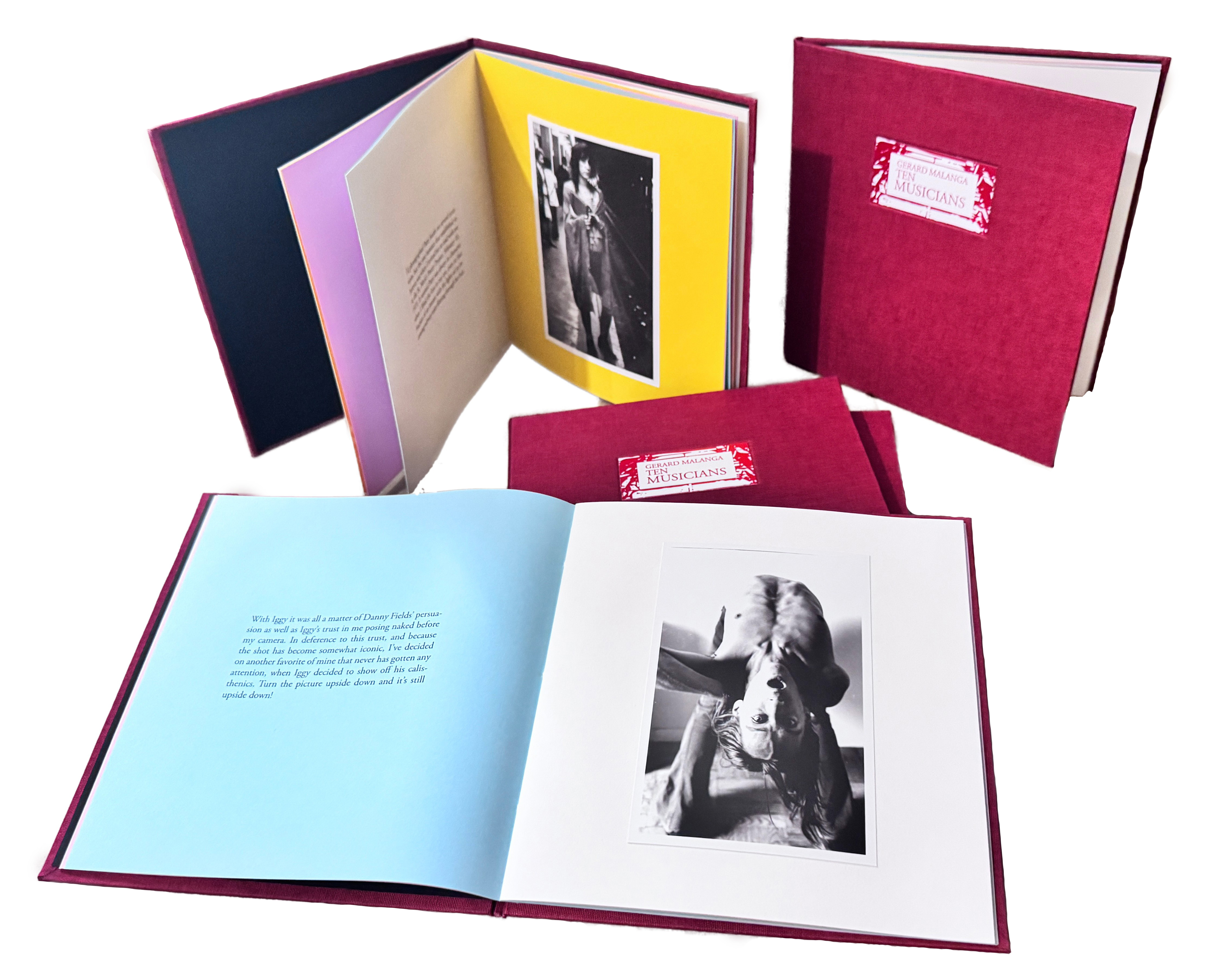 10 Musicians was digitally printed and handbound in cloth over boards. Contains ten 4" x 6" photos tipped-in. Each copy is signed and numbered by Mr. Malanga.