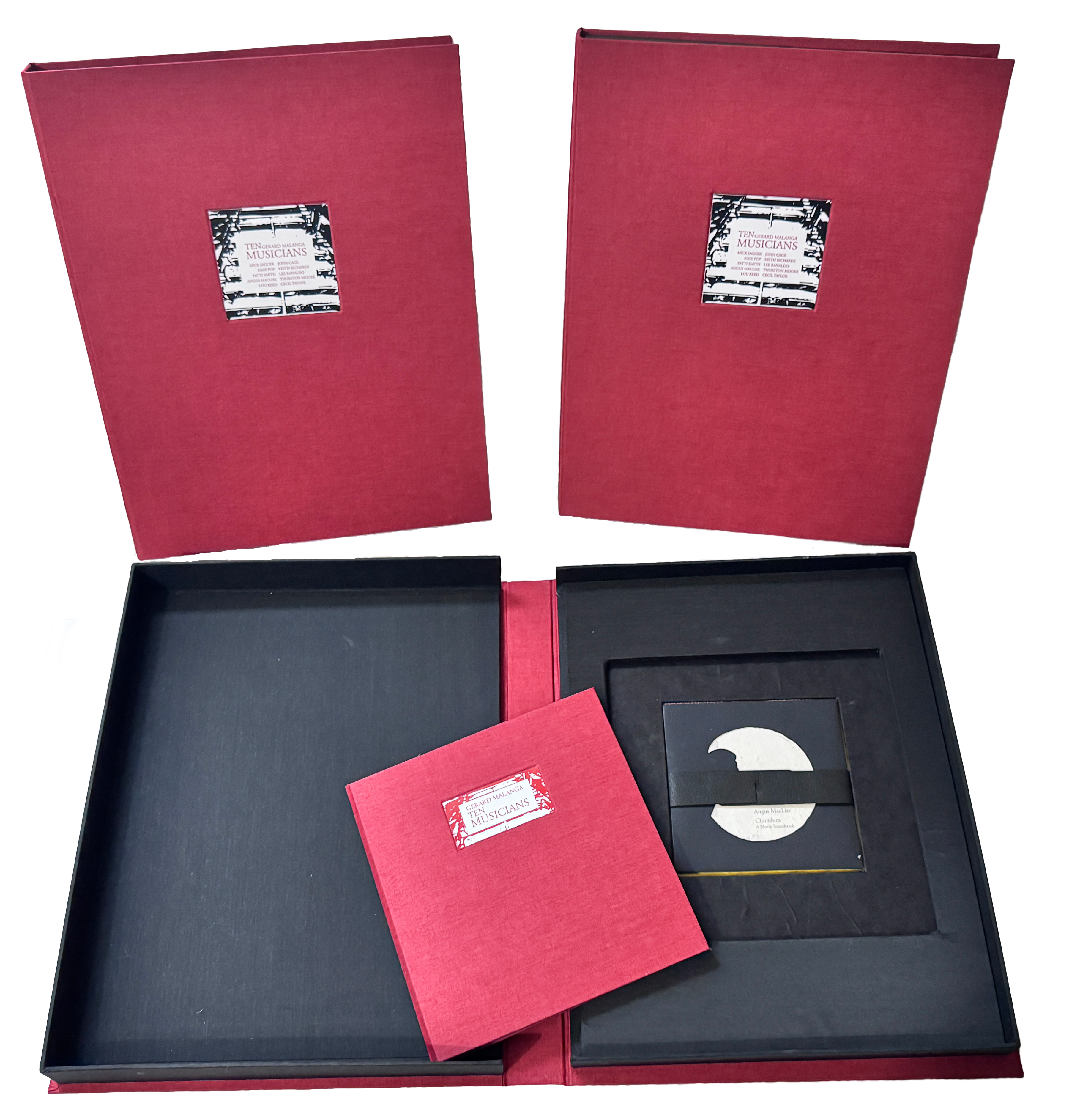 10 Musicians contains 10 silver gelatin photographs, each measuring 11” x 14” (27.9 x 35.6 cm). Each photograph is signed and numbered by the photographer on the reverse. Also included in the set is a hand-bound book & 2 previously unreleased CDs by Angus MacLise. The clamshell case is fully bound in Japanese & Italian book cloth. All materials are acid-free and archival.