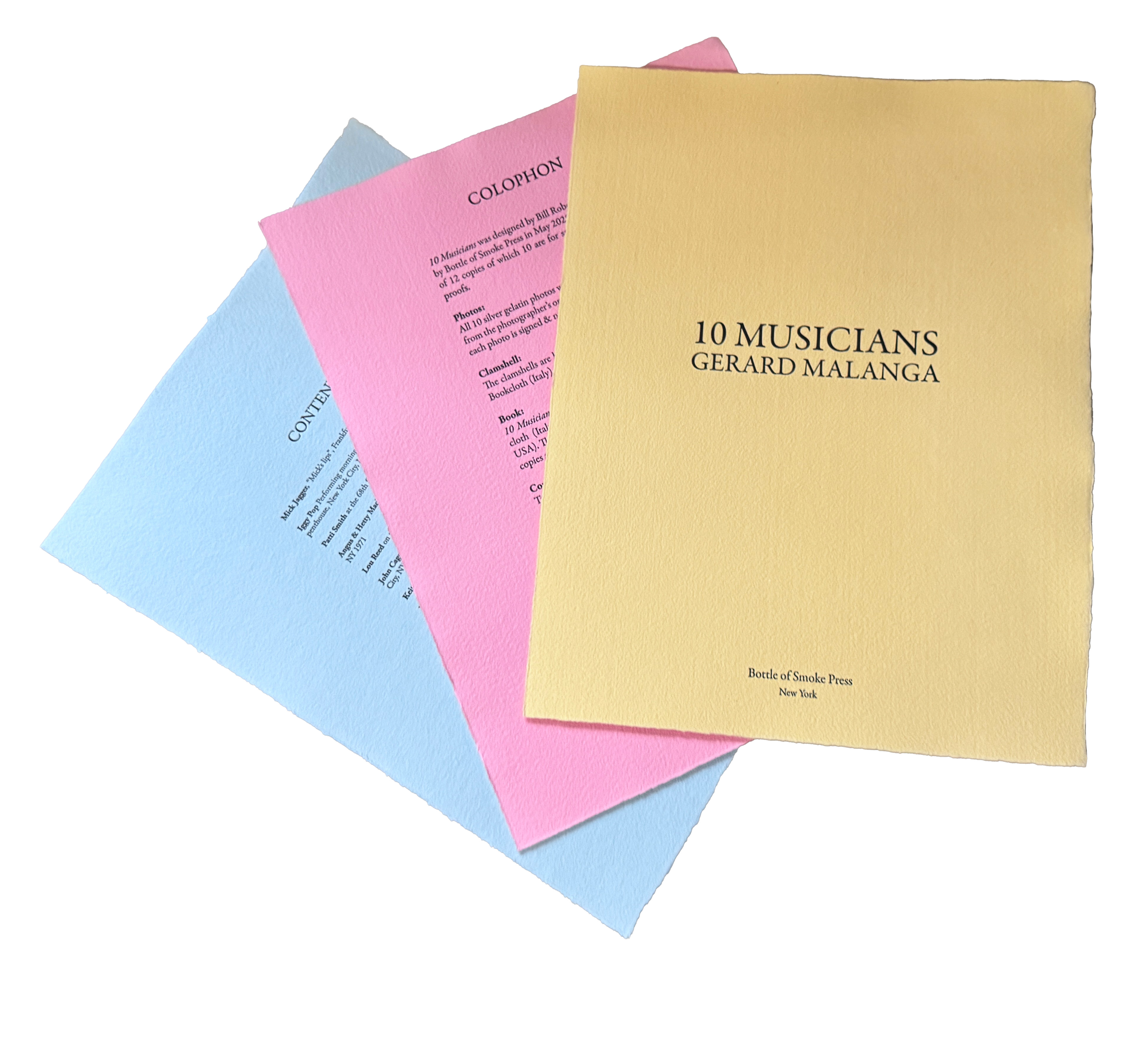 10 Musicians was designed by Bill Roberts and was published by Bottle of Smoke Press in May 2025. Bound and printed by Bill Roberts unless otherwise noted.